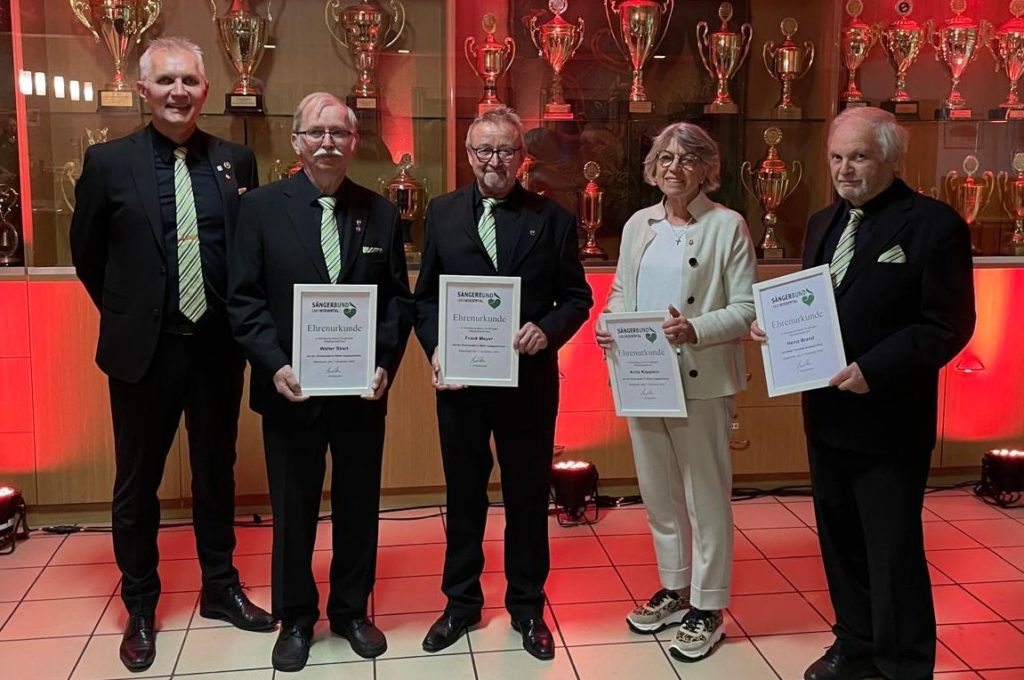 Traditionell findet im Rahmen der Weihnachtsfeier die Ehrung langjähriger und verdienter Mitglieder statt. So konnten in diesem Jahr Anita Käpplein, Frank Meyer und Walter Streit vom ersten Vorsitzenden Bernd Heim für 25 Jahre Mitgliedschaft geehrt werden. Seit 30 Jahren aktiver Sänger beim Sängerbund ist Hans-Joachim Gottschalk. Heinz Brand hält dem Verein bereits seit 65 Jahren die Treue und Reinhold Heißler kann auf stolze 75 Jahre Mitgliedschaft zurückblicken.